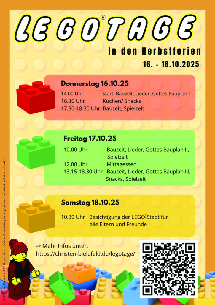 Unsere Großbaustelle „LEGO®-Stadt“ findet vom 16.-18. Oktober 2025 in der christlichen Gemeinde Osningstraße 87 in Bielefeld-Sieker statt und könnte zum Beispiel so aussehen: